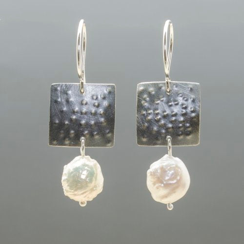 Made with sterling silver and freshwater pearls, Janet Squared is a flirty little earring that dangles to just the right length. The sterling silver has been oxidized and textured with little raised dots that look like stars in the night. The shape is ever so slightly concave to add dimension. Adorned with organic shaped baroque/druzy pearls, each one is truly unique. The earring is finished with a bright sterling silver ear wire.