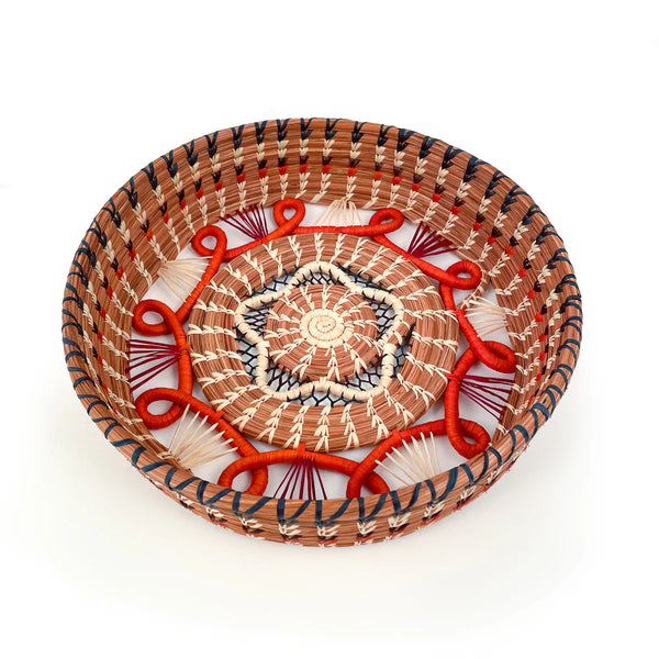 Update your home décor with the Cristina Basket in Orange! Featuring intricate orange loop detailing and accented by a star-shaped center, this stunning basket will shine as part of your table setting or a basket wall. Pops of orange, blue, and brown stitching accent this eye-catching centerpiece. Designed by our artisan partners in Guatemala, the complexity of this basket showcases their profound skill and creativity. Handcrafted from pine needle and raffia.