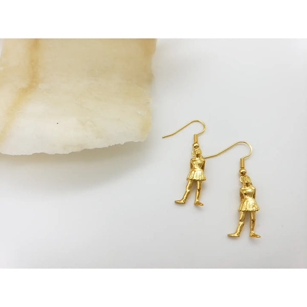 The original sculpture by Edgar Degas (1834-1917) was completed and exhibited in wax in 1881. A number of bronze casts were made in 1920 and are customarily exhibited with real gauze skirts and satin hair ribbons. These earrings recreate the original artwork with intricate detail, making them an elegant way to pay homage to a classic.