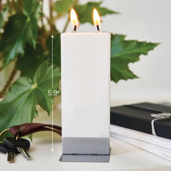 "Hand-painted á Drip Resistant á Twin wicks burn evenly á Self-extinguishing á Unscented and smoke-free Hand-painted in Lithuania, these candles stand out in their simplicity. The flatter design is a unique approach to candles that have a minimal and eye-catching feel. The twin wicks burn evenly and self-extinguish as they near the steel base, without any dripping wax or smoke. -Handmade using the highest quality German raw materials -Twin wicks ensure candle burns evenly and self-extinguishes as it nears the base -Steel stand helps make candle attractive display piece and doubles as a snuffer -Non-dripping, evaporates as it burns -Unscented and smoke-free -Every candle is hand painted -Creative gift and great stocking stuffer -Fits perfectly inside a greeting card Burning time: 3-4 hours Made in Lithuania Materials: Highly Refined Paraffin wax, Steel, Organic Cotton Wick Includes: One handmade flat candle and steel stand