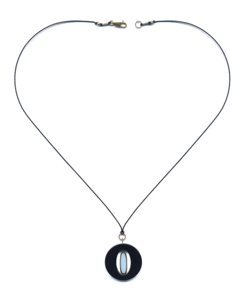 German vintage glass beads (24k gold bead detail) and onyx, nylon cord, 14k gold fill findings, total length: 17.25 inches, pendant drop: 1.25 inch, pendant width: 1.25 inch