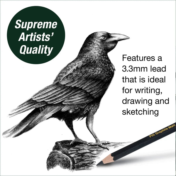 An exciting new innovation in artist materials, Faber-Castell presents the extremely matte graphite pencil of supreme artists' quality - The Pitt Graphite Matte Pencil. Unlike other graphite pencils that create a luster when applied heavily, these pencils offer an ultra-matte graphite laydown for reduced reflection on paper. They have the highest tonal value density for maximum depth effects. With a smooth graphite laydown, they are ideal for writing, drawing and sketching. They are especially suitable for monochrome graphite work.