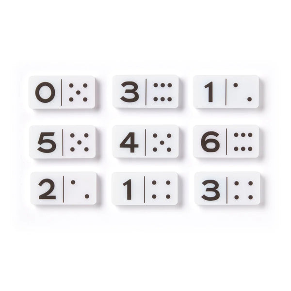 • Includes 28 double-sided acrylic dominos. In other words, each side features a unique design so that you can play using either numbers or shapes. Psst: look at the pictures.